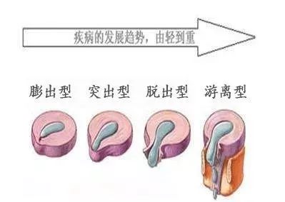 那么什么是腰椎间盘?很多人搞不明白,以为椎间盘是骨头,这个观念是错误的。椎间盘实际上是脊柱中上下椎体之间的结构,它的主要功能是缓冲椎体的直接压力。椎间盘的结构很像洋葱,最中间的是髓核,髓核往外就像洋葱一层层的纤维环,当纤维环破裂,椎间盘当中的髓核就容易向外凸出,凸出比较轻的是膨出,当凸出比较严重时就是椎间盘突出了,最严重的就是椎间盘脱出了。