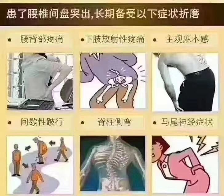 三:后期严重体现压迫神经,腰部腿部麻木、发冷、肌肉萎缩、跛行及放射性疼痛;早发现早治。